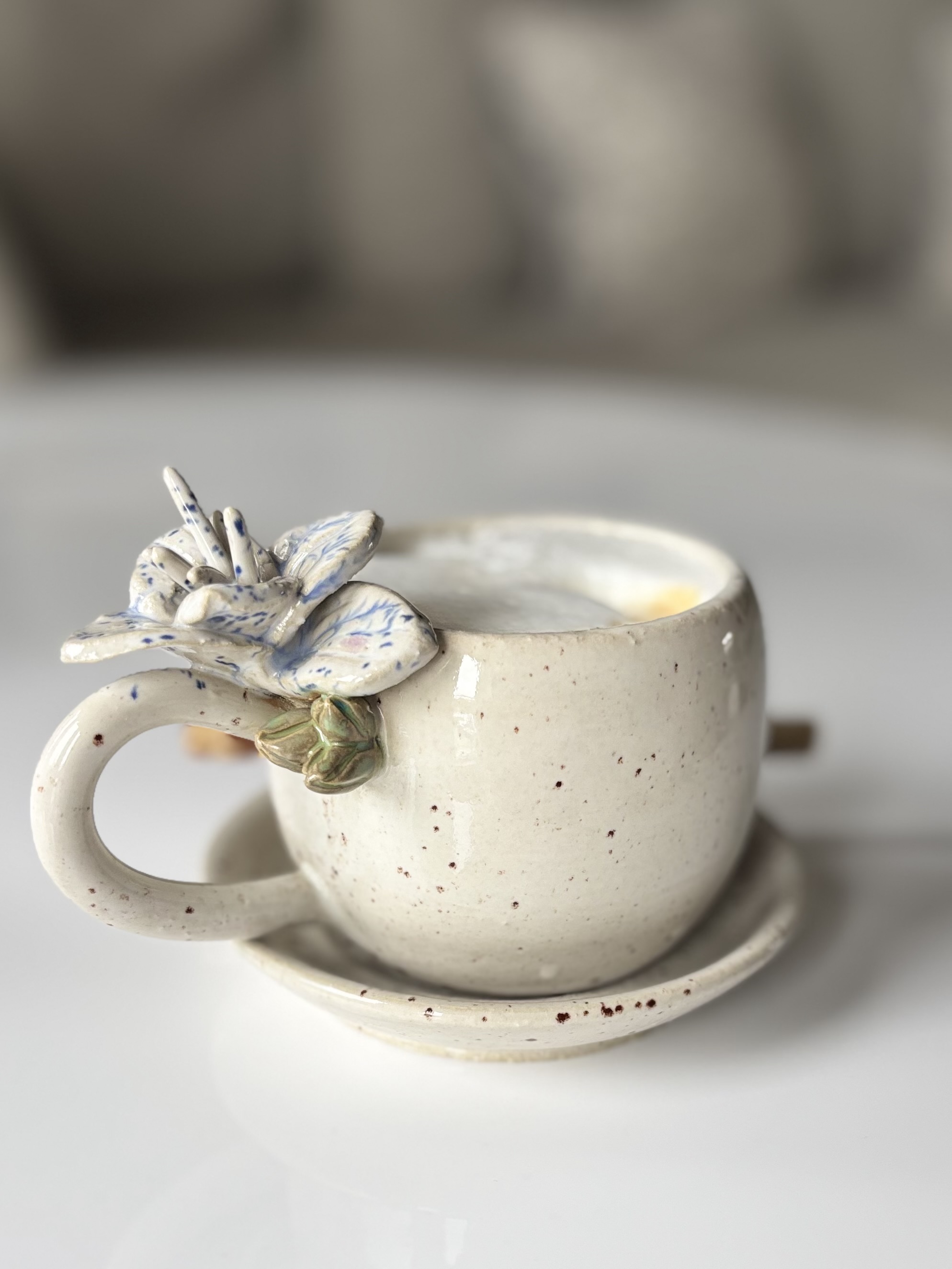 Filiżanka z kwiatem w zestawie ze spodkiem. Szkliwo jasne nakrapiane. Na kwiatku szkliwo posiada niebieski nakrapiany efekt. Wypalone w temp. 1250 stopni.