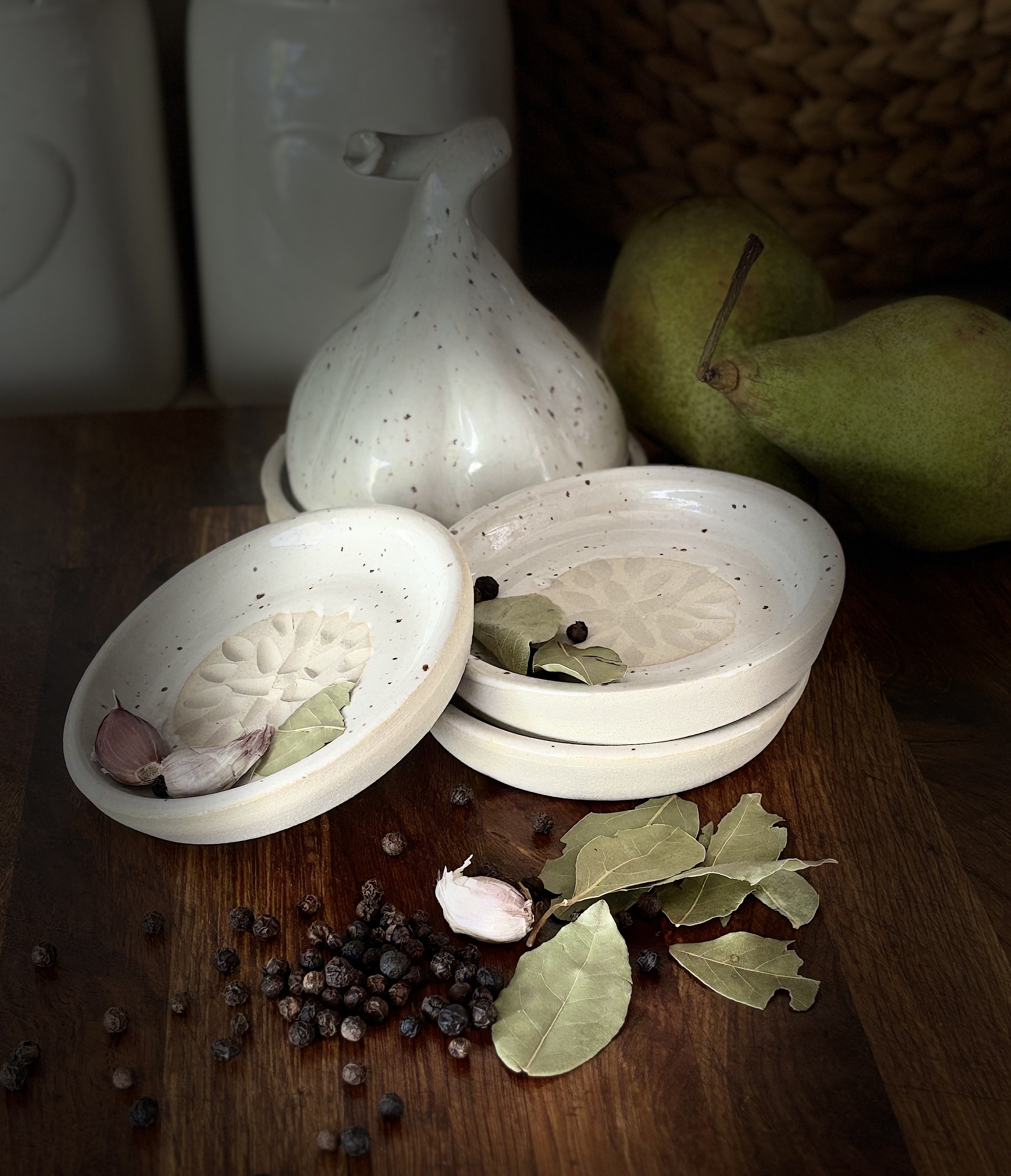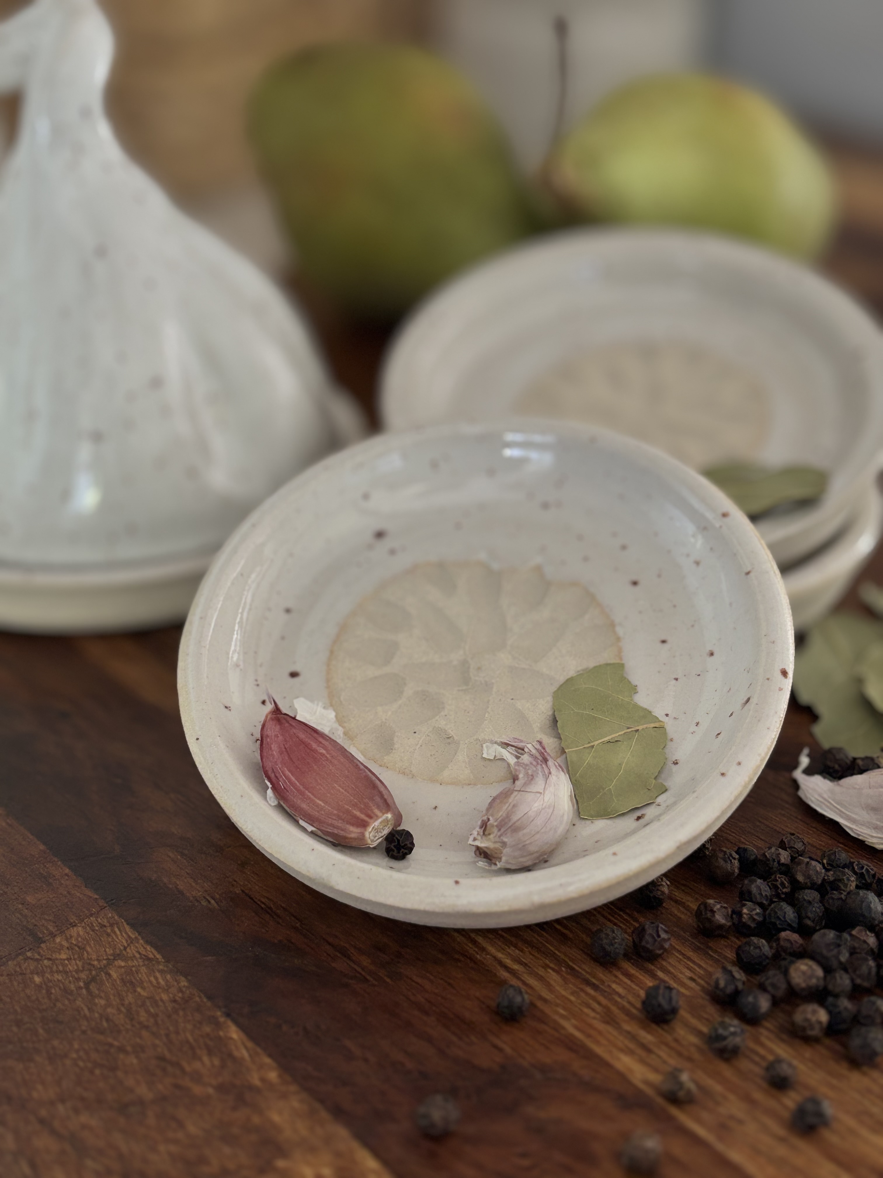 Ceramiczna tarka o średnicy 10 cm. Jest to talerzyk z chropowatym środkiem, boki szkliwione, na którym możesz ścierać czosnek czy imbir. Możesz rozcierać nawet przypieczone pomidorki lub paprykę. Grater stanowi do tego elegancką ozdobę w kuchni, która szkliwem pasuje do innych naszych produktów, takich jak czosnek pojemnik, małe miseczki na przyprawy czy też kubeczki z serduszkami.