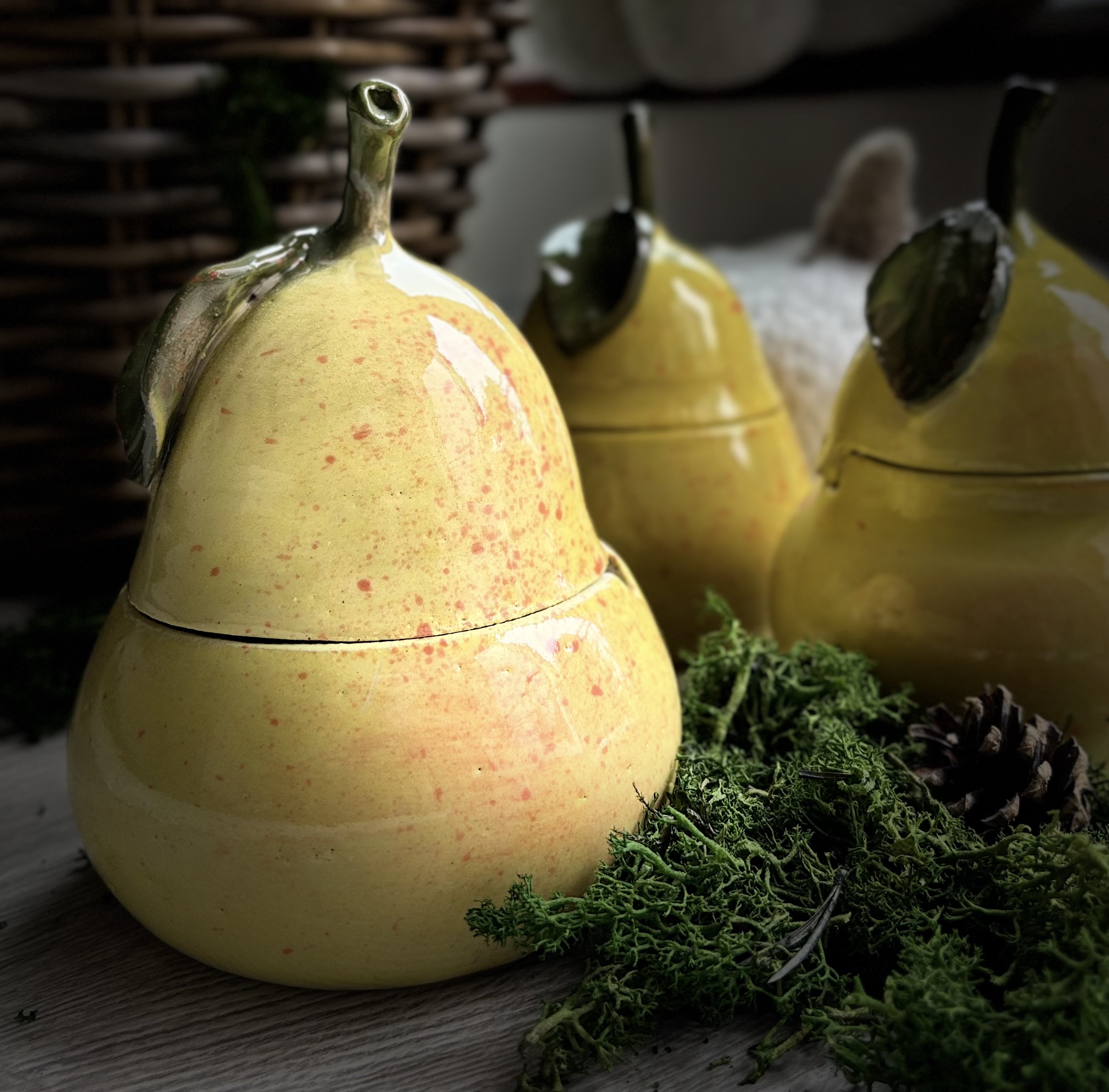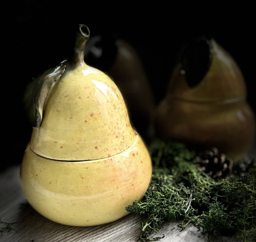 Ceramiczna gruszka cukiernica, pojemnik. Wytoczona na kole garncarskim a także ręcznie wykonane zostały elementy łodygi i liścia. Wysokość gruszki 15 cm, szerokość w najszerszym miejscu 10 cm. Gruszka jest produktem rękodzielniczym i nie każda jest taka sama. Wszystkie różnią się od siebie.