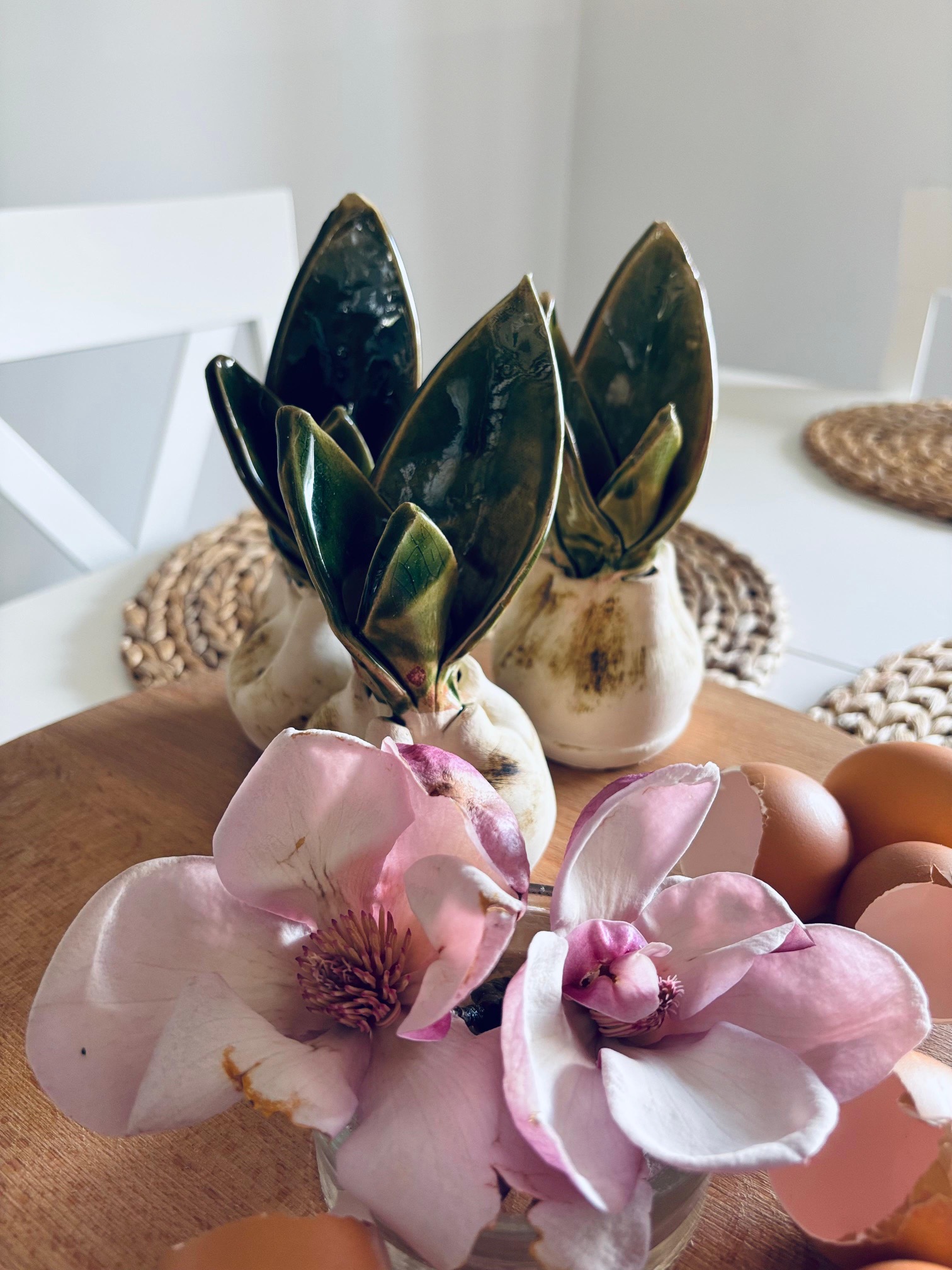 Cebulki tulipanowe wykonane częściowo na kole garncarskim a częściowo ręcznie. W dolnej części wykorzystano produkty odwzorowujące ziemię, zaś górna cześć w całości jest pokryta szkliwem. Cebulki są w wysokości nie więcej niż 20 cm. Idealnie nadają się na dekorację. Całość wypalona w temp. 1050 st, zalecany jest brak kontaktu z wodą. Cena dotyczy jednej sztuki cebulki.