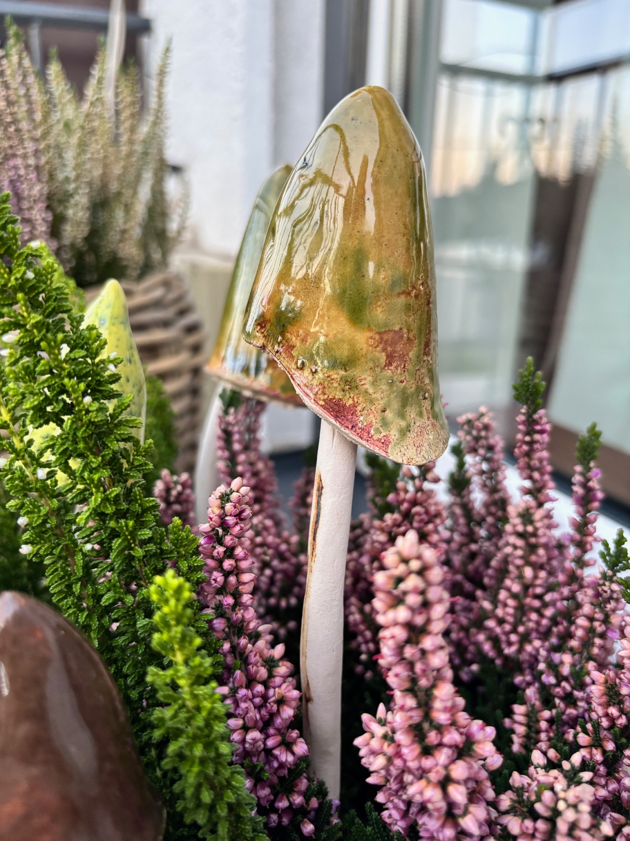 Ceramiczny duży grzybek, stanowiący dekorację. Kolor zielony z brązowymi przebarwieniami. Wysokość grzybka wraz z nogą około 30 cm. Każdy grzybek różni się od siebie, ponieważ jest to produkt rękodzielniczy. Widoczne ciemne przebarwienia na nóżkach jak i od wnętrza kapelusza, są efektem celowym.