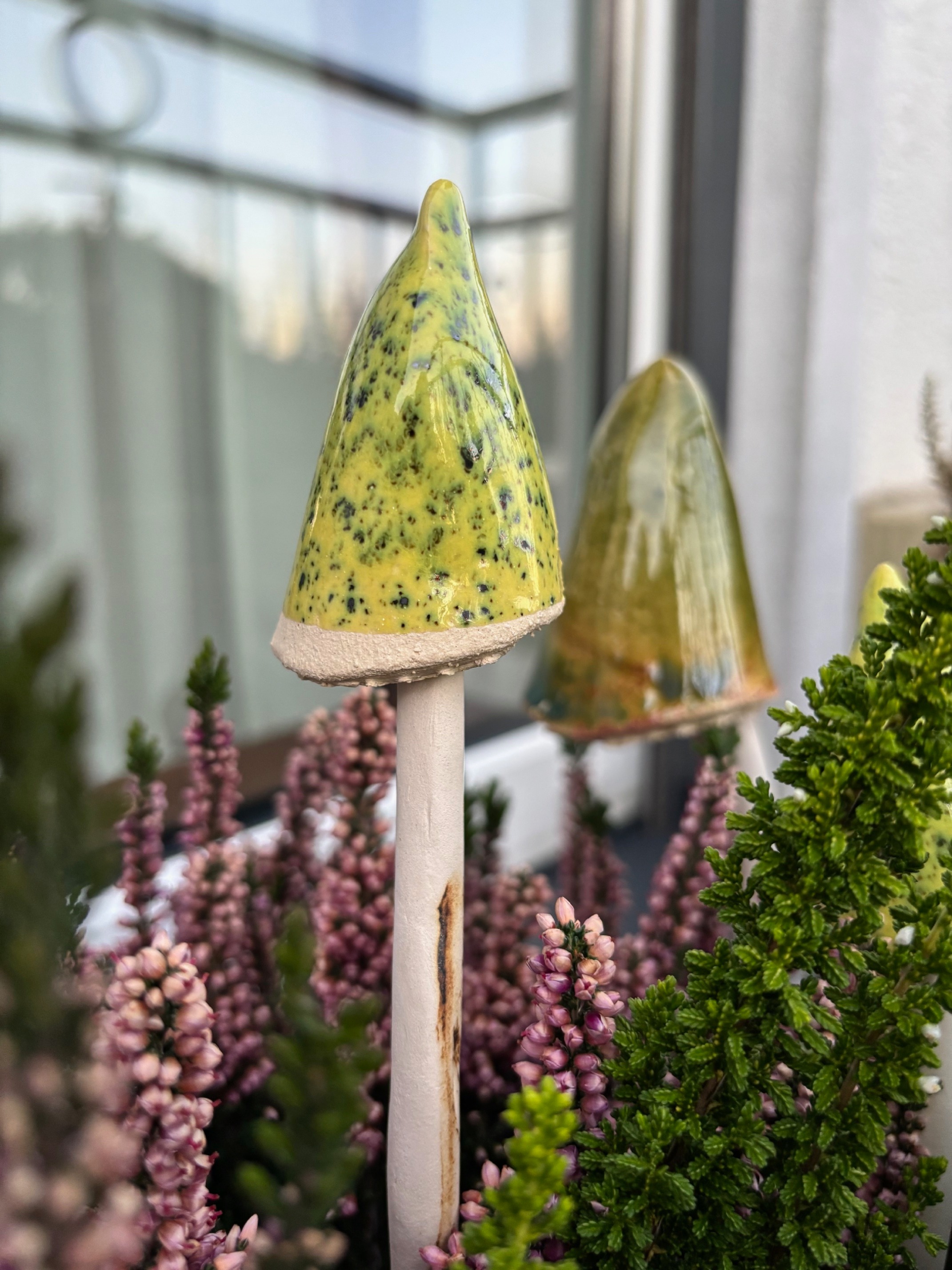 Ceramiczny grzybek mały, stanowiący dekorację. Kolor zielony nakrapiany. Wysokość grzybka wraz z nogą około 19-20 cm. Każdy grzybek różni się od siebie, ponieważ jest to produkt rękodzielniczy. Widoczne ciemne przebarwienia na nóżkach jak i od wnętrza kapelusza, są efektem celowym.