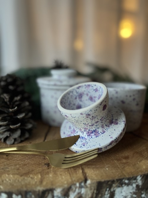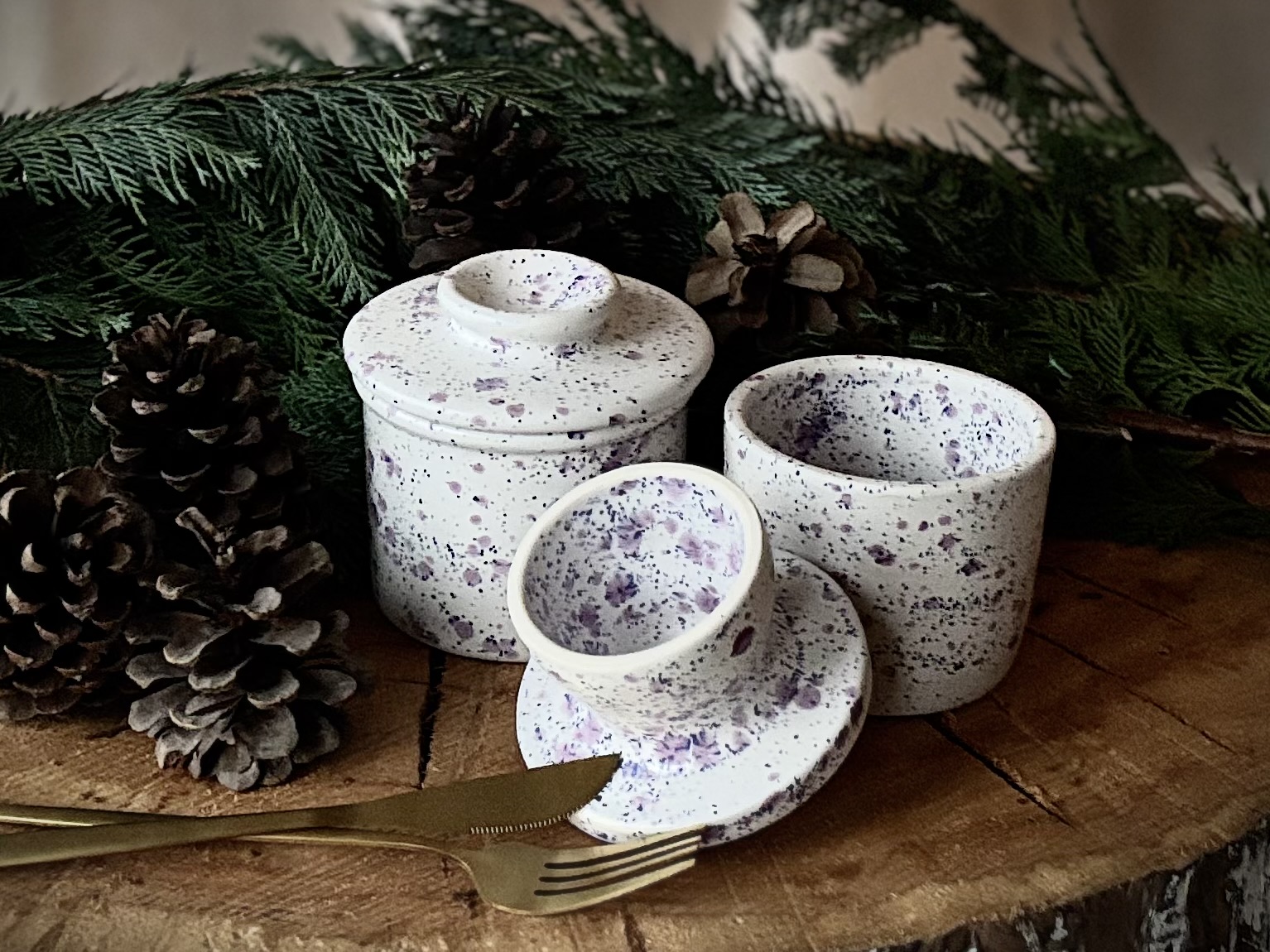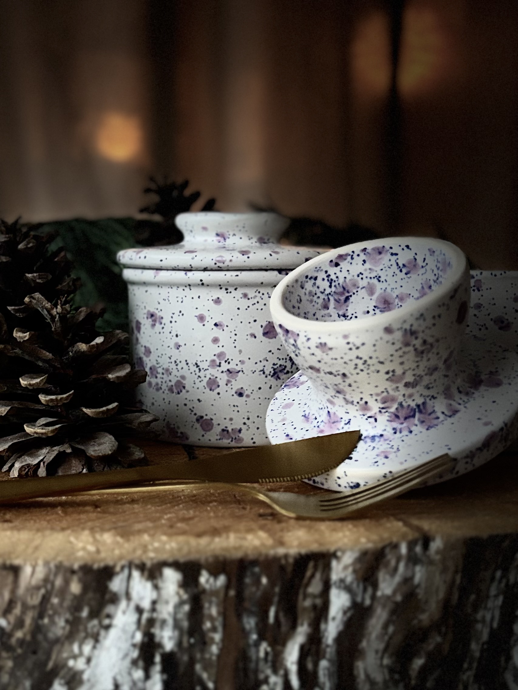 Elegancka maselnica francuska (tzw. butter bell) wykonana ręcznie w naszej pracowni z wysokiej jakości ceramiki. Utrzymana w jasnym kolorze z subtelnym, fioletowym efektem szkliwa, zachwyca delikatnością i nowoczesną formą. To nie tylko praktyczny pojemnik na masło, ale również wyjątkowa ozdoba kuchennego blatu. Dzięki tradycyjnej konstrukcji maselnicy francuskiej masło pozostaje świeże, miękkie i gotowe do smarowania przez wiele dni, bez chłodzenia w lodówce. Wystarczy wlać odrobinę zimnej wody do dolnej części naczynia, aby stworzyć naturalną barierę chroniącą masło. Wymiary: ø 10 cm, wysokość 11 cm